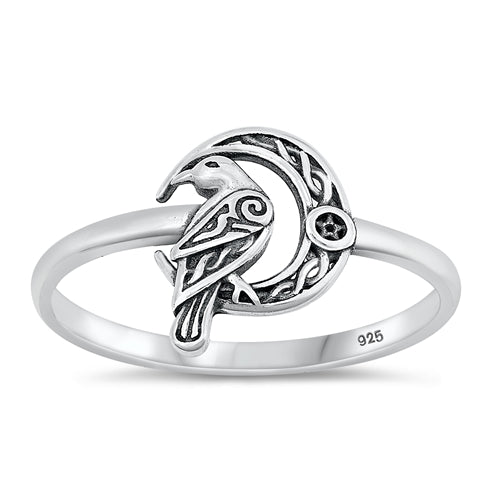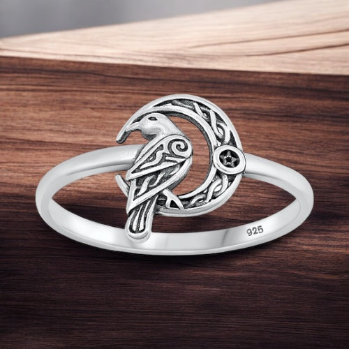 925 Sterling Silver Celtic Raven on Crescent Moon Ring